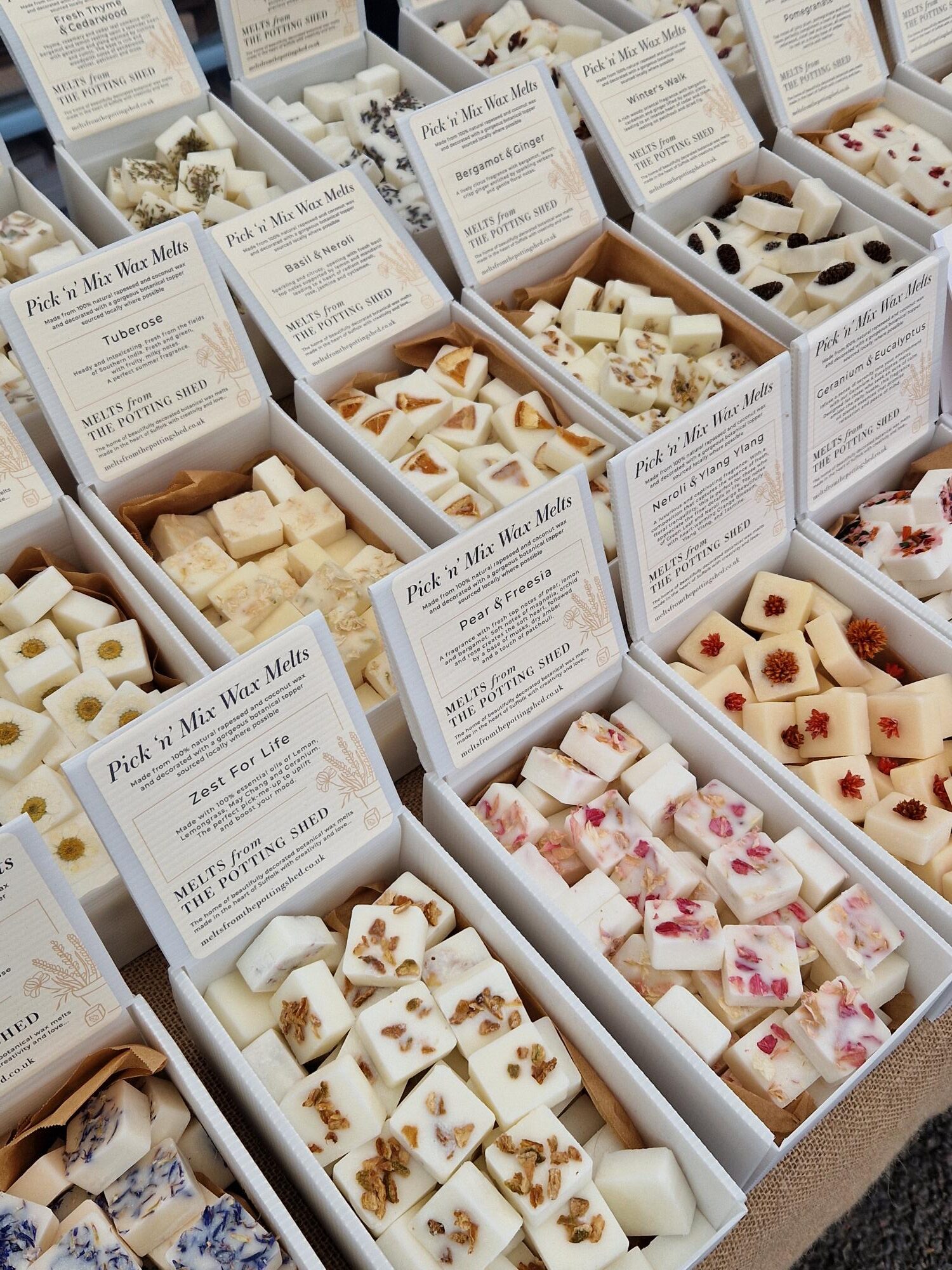 Melts are made from 100% natural rapeseed and coconut and decorated with a gorgeous botanical topper, for easy identification and sourced locally where possible. Each melt weighs e.10-12g and offers between 15 and 20 hours of fragrance.