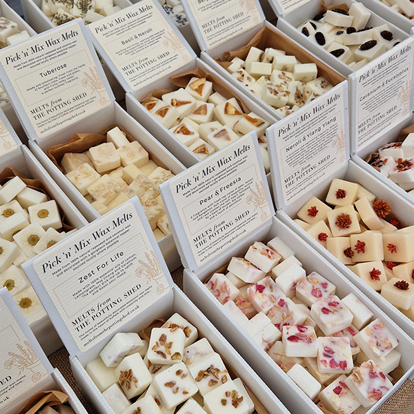 Melts are made from 100% natural rapeseed and coconut and decorated with a gorgeous botanical topper, for easy identification and sourced locally where possible. Each melt weighs e.10-12g and offers between 15 and 20 hours of fragrance.